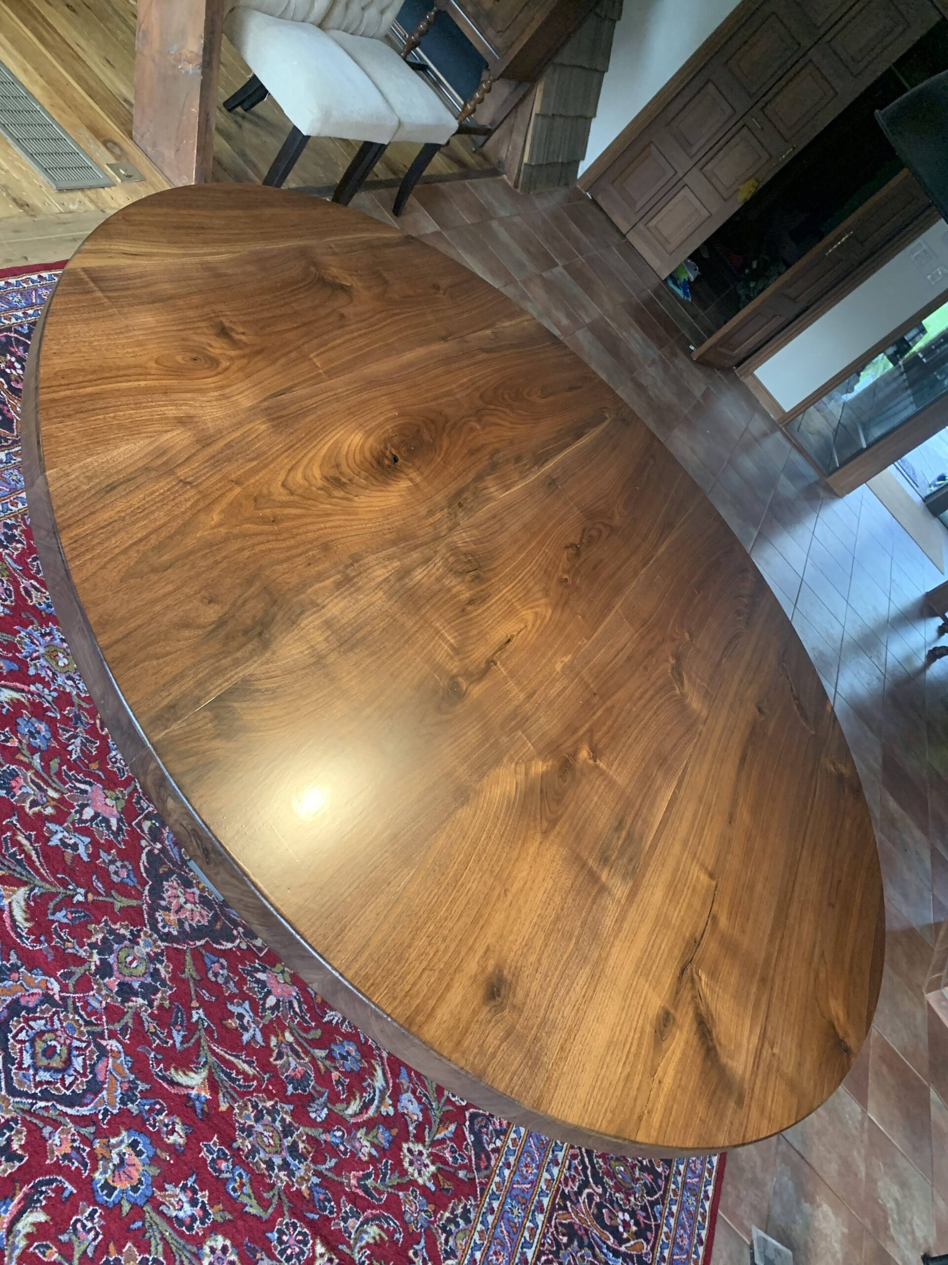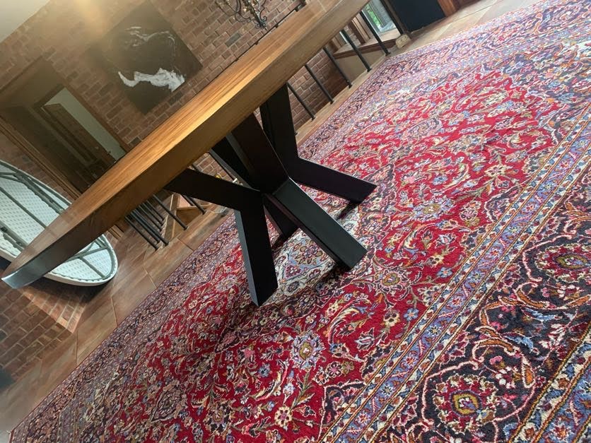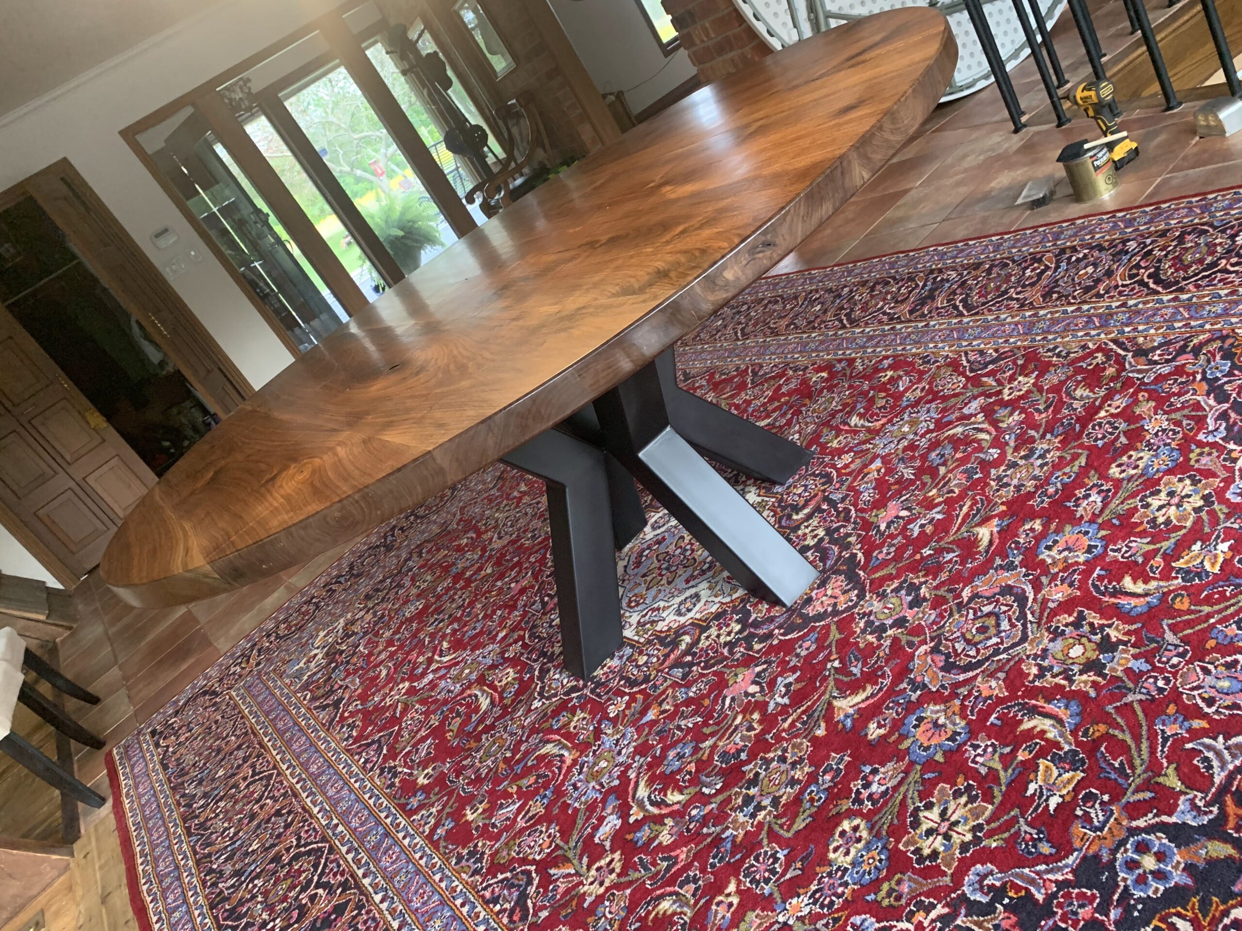 I made it out of 5 14 foot long live edge slabs that I squared and then cut in half. the gluing process took about 5 days but while the glue was drying I welded those legs up with 4’x4′ steel which I think turned out cool.