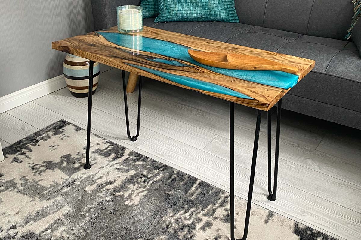 Custom built-to-order epoxy river coffee table in light blue, which is sure to boost your living room’s elegance. Designed and built by Pryce Designs.